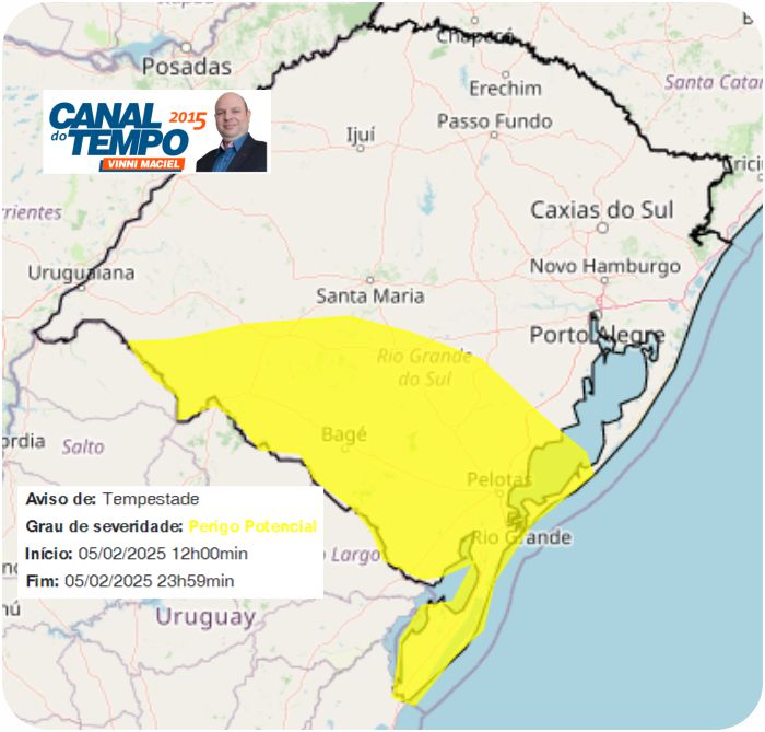 O INMET — órgão que monitora o clima do país — emitiu alerta de tempo severo para 43 municípios espalhados pelas regiões Sul, Campanha e Fronteira Oeste (veja lista abaixo), que podem registrar chuvas intensas de até 50 milímetros, rajadas de vento de 60 km/h e possibilidade de queda de granizo.